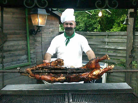 Ein ganzes Spanferkel im mobilen Grill für Ihre Festlichkeit.